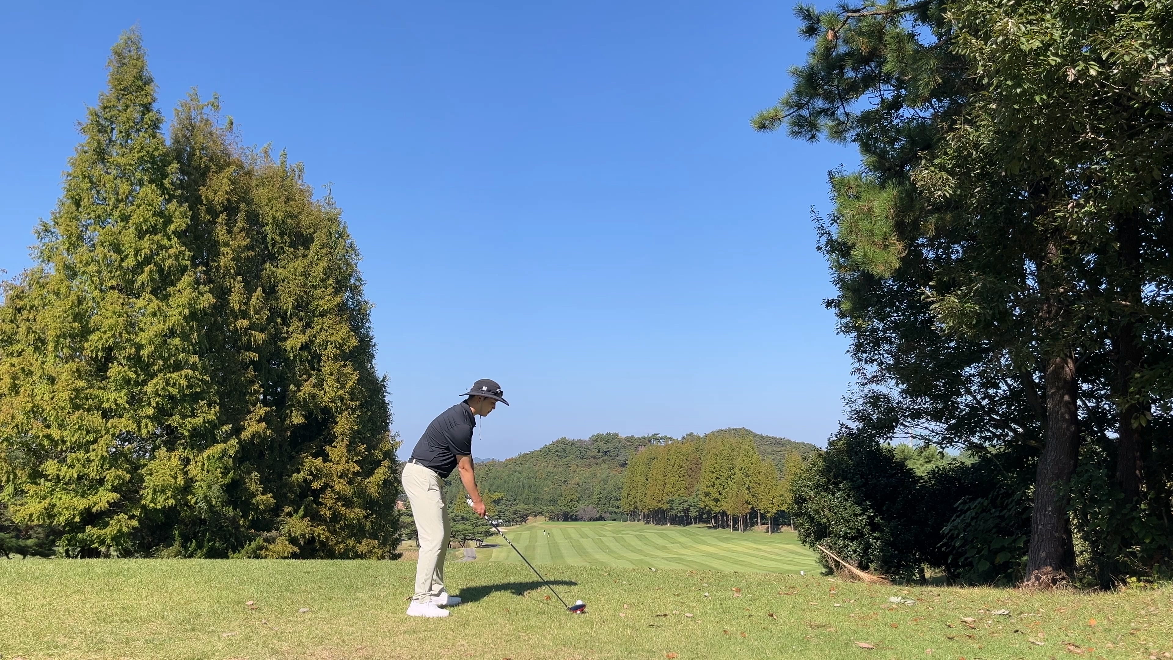사진에 보이는 OB 라인보다 왼쪽으로 가로지르면 최단거리로 갈 수 있지만 로컬룰 상 간판 우측을 겨냥해야 합니다.