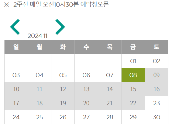 예를들어 11월 23일 토요일에 부킹을 하고 싶다면 2주전인 11월 8일 오전 10시 30분에 예약을 하면 됩니다.
