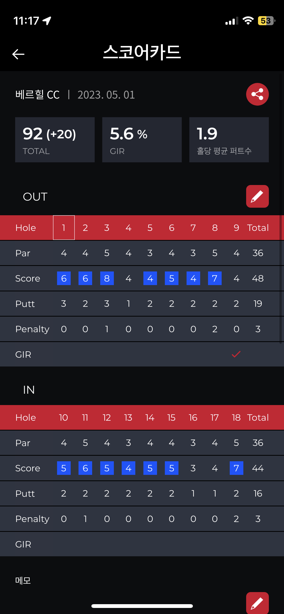 그래도 좋아진 점이라면 짧은 거리의 퍼터는 거의 다 성공시켜서 2펏이 많았습니다.