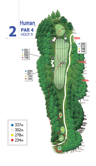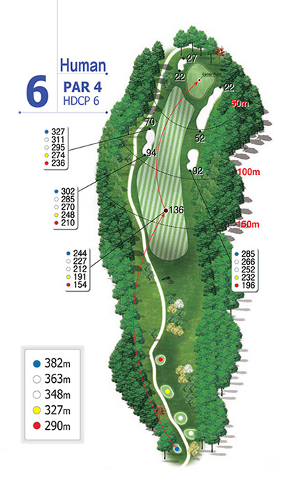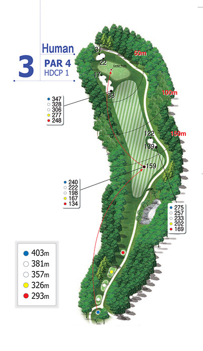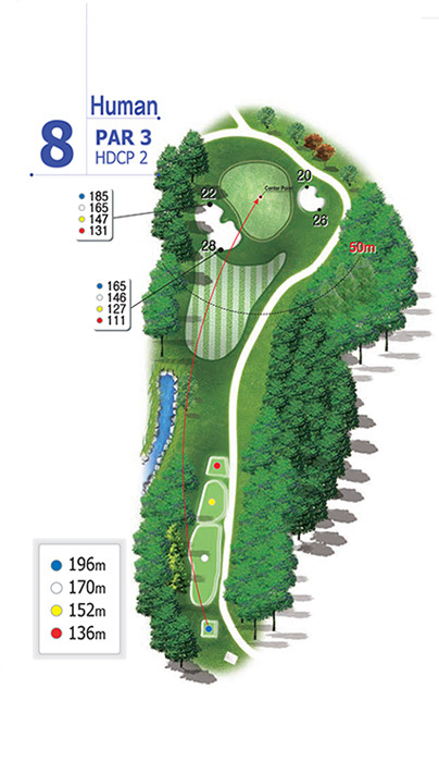 화이트티 기준 파3 170m지만 약간 내리막이라 160m 정도를 보고 치면 된다.