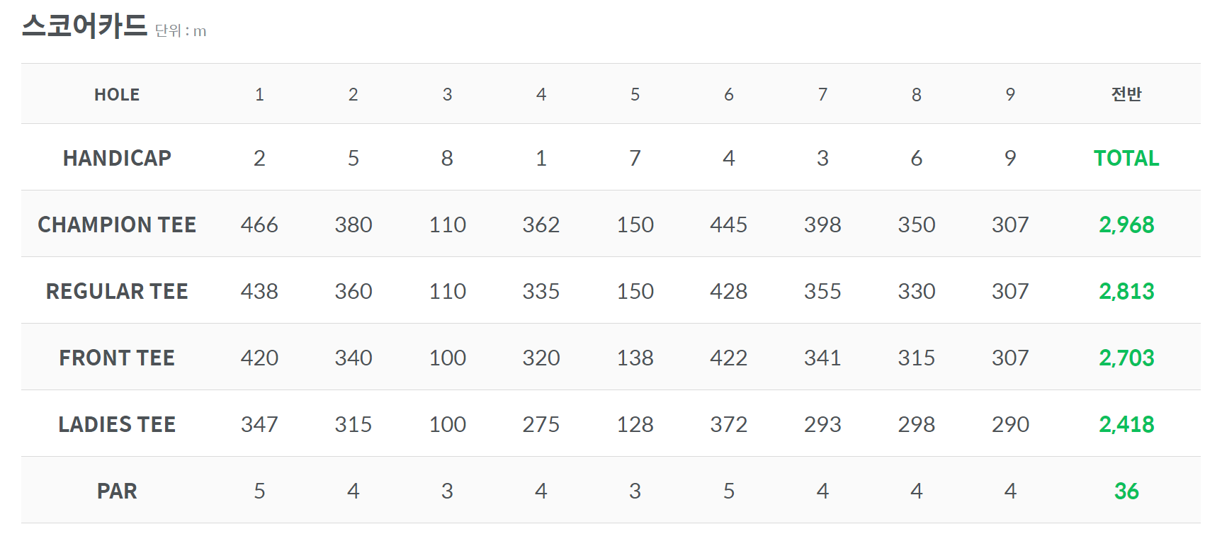 화이트 티 기준 307m라서 시원하게 티샷을 날려보기 좋습니다.